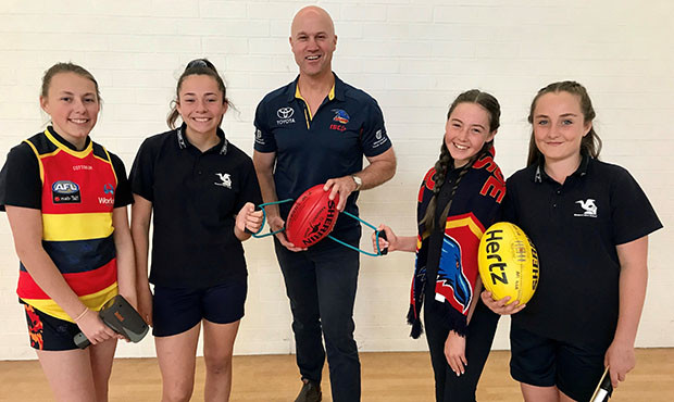 Nigel Smart with students from Mawson Lakes School who will take part in the STEMfooty program