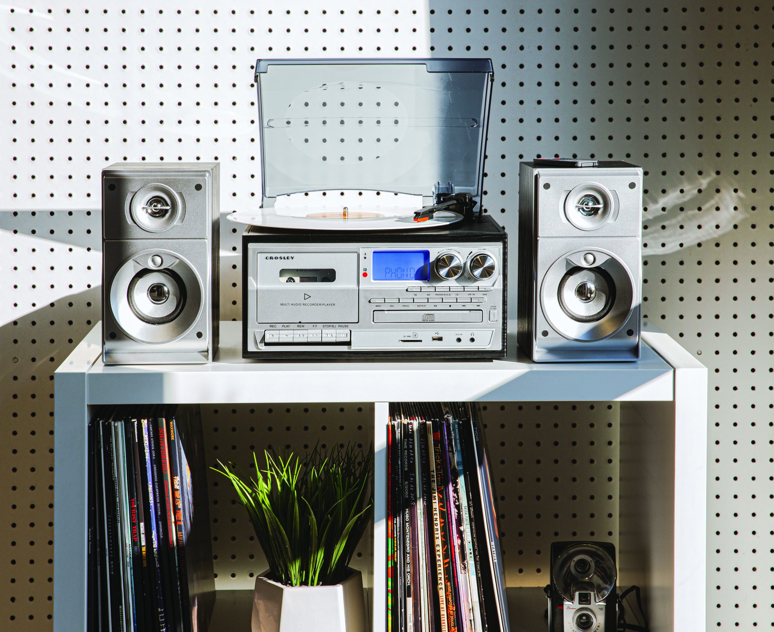 Even though video killed the radio star, we totally love the 80s! A decade of big hair, synth pop, cassettes and fashion that still influences the runway today. Cheeuh! We also love the tech-inspired, slightly gaudy electronics from this time period, so we had sweet dreams of creating our own take on an 80s entertainment system. Introducing the sweet child of ours: the Crosley Eclipse.