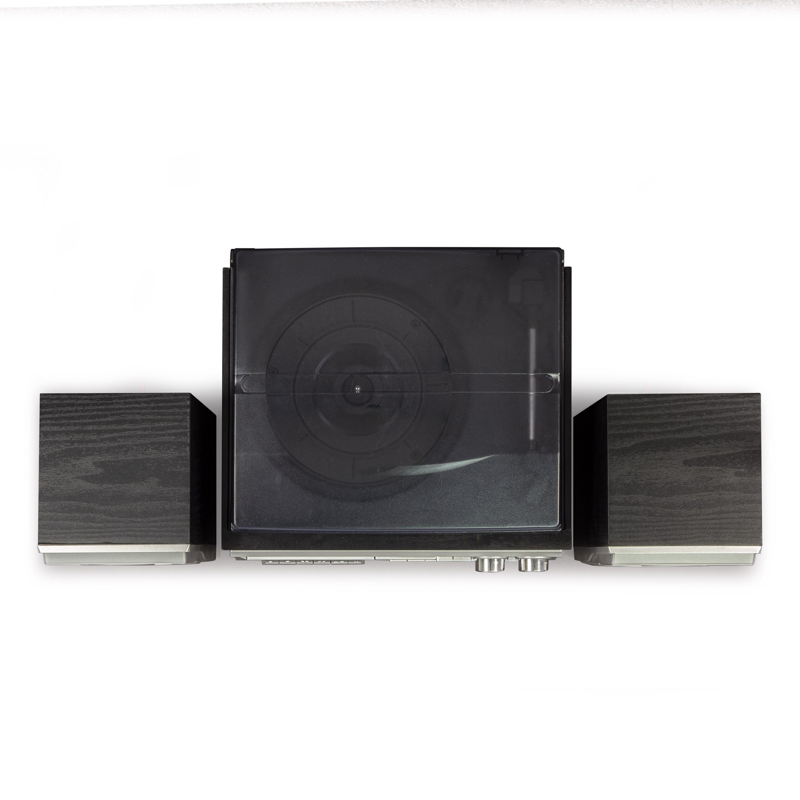 The system features 3 speeds (33 1/3, 45 & 78 RPM, Built-in Bluetooth Receiver, Cassette Player, AM/FM Radio, CD Player, Headphone Jack, Aux Input, External Full-Range Stereo Speakers, RCA Output, Remote Control, Record Function, USB/SD Playback & Recording Functions