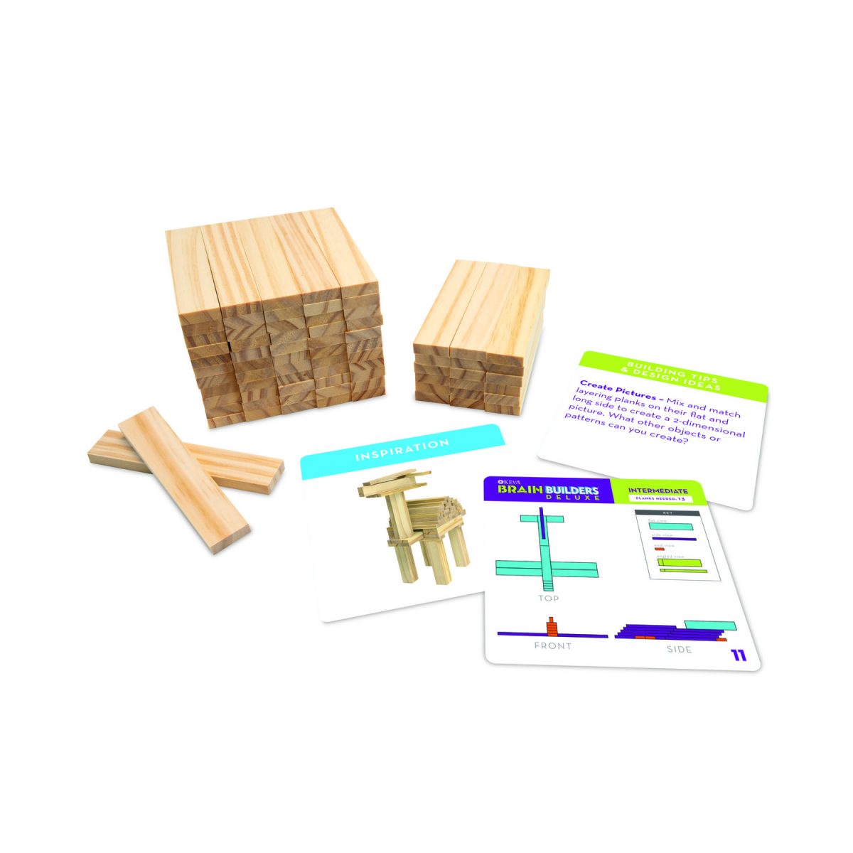 Even more, challenges to train the brain with KEVA planks! Deluxe Brain Builders combines 20 KEVA planks with even more double-sided puzzle cards with a 2-D challenge on one side and its solution on the other. Difficulty increases from beginner to expert. Recreate the 2-D patterns into 3-D structures if you can! Once you think you’ve solved the blueprint, flip it over to check the solution—which shows the design from different angles highlighting the front, side and overhead view. As each build becomes more challenging, patience and confidence are gained through trial and error. From crates and staircases to hammerhead sharks, you will be amazed by what your brain will build!