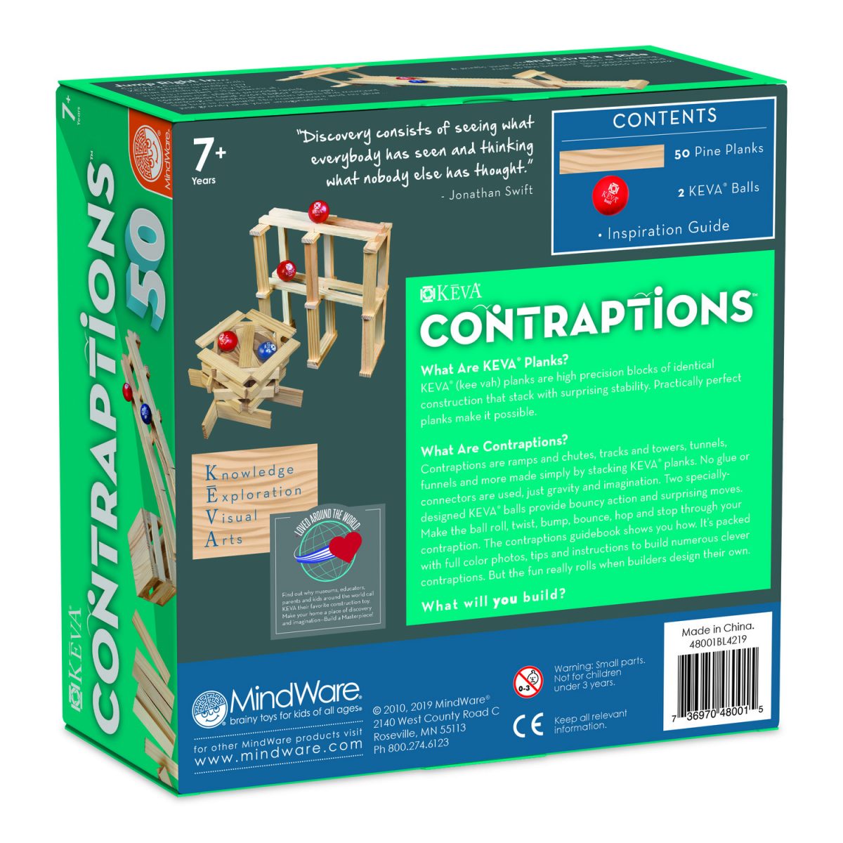 Young thinkers can design unbelievable ball track structures via simple, stacking planks. No glue, no connectors-just loads of constructive fun! The 50-Plank Set helps kids get things rolling with two balls and an instruction book detailing how to build a “Shooting Gallery,” “Turbine,” “Step Curve” and more. Fully compatible with our larger, 200-Plank KEVA Contraptions Set.