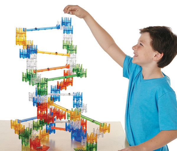 Q-BA-MAZE is a unique system of colorful cubes that interlock to form an exciting marble run. The big difference? The configurations are UNLIMITED: create runs shaped like rockets, robots, butterflies, or whatever design you want!
