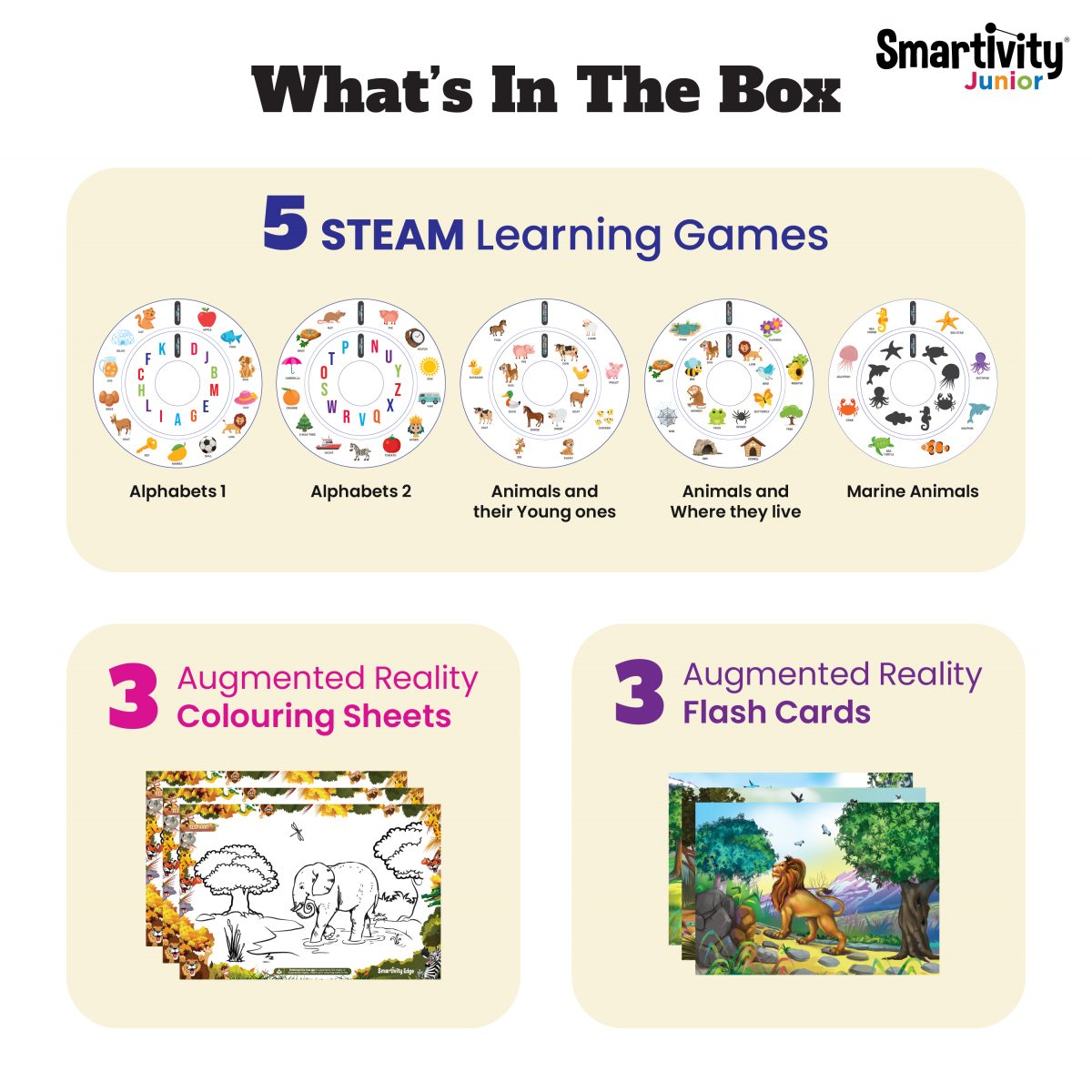 - 3 (three) Augmented Reality (AR) Enabled Colouring Sheets with Smartivity’s patented colour and pattern recognition technology, to bring your child’s imagination to life