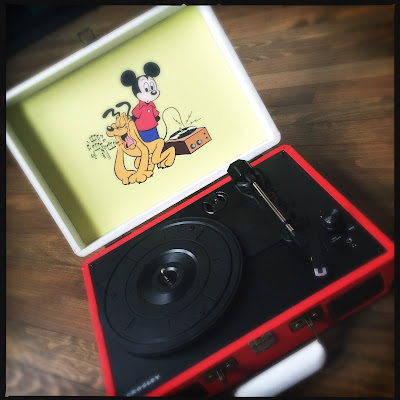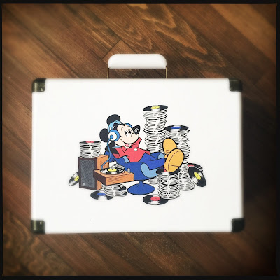The turntable itself is classic white and red, with vintage style brass hardware.  1970’s style Mickey Mouse is found lounging on the top, listening to piles of records.  I wonder what Mickey is listening to?  My bet is on Robyn.