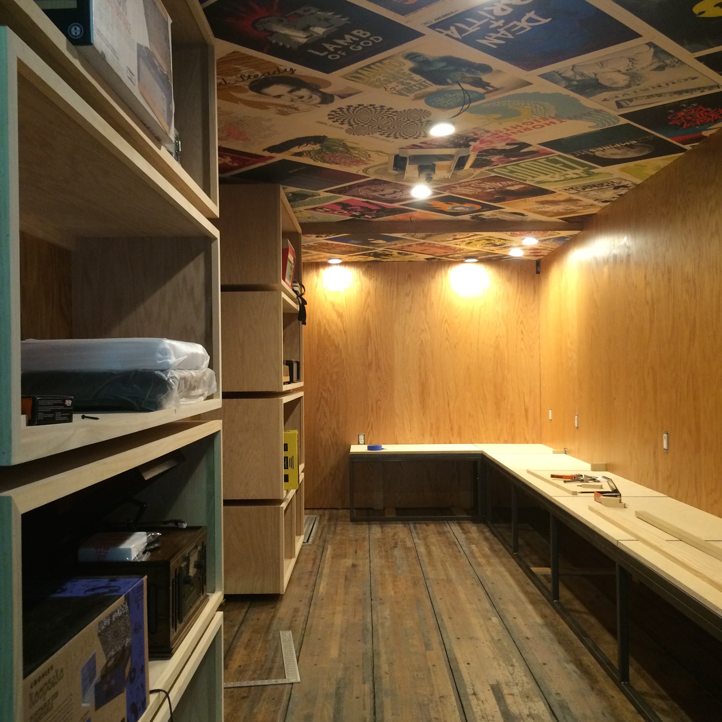 So, six months and a lot of sweating later, we’re happy to announce that the Crosley Cruiser is on the road! Not only are we a champion for analog music, we’re also an ambassador for our home city of Louisville, Kentucky. When we looked for art to make our truck really stand out in the face of colorful music festivals, we turned to local artist, Robbie Davis. Robbie’s collaborated with one of our favorite local breweries, Against the Grain, and we loved his raw, funky style. We wanted the art to reflect our home heritage, and the atmosphere of a summer music spot. If you look close, there’s shout-outs to Louisville culture all over. (The horse with the guitar is the most obvious, but look for the fried chicken bucket, the bourbon barrels, and baseball bats!) Our guys also took a day to coat the ceiling in hand-screenprinted, hand-numbered posters from Powerhouse Factories. (See if you can find your favorite up there!)